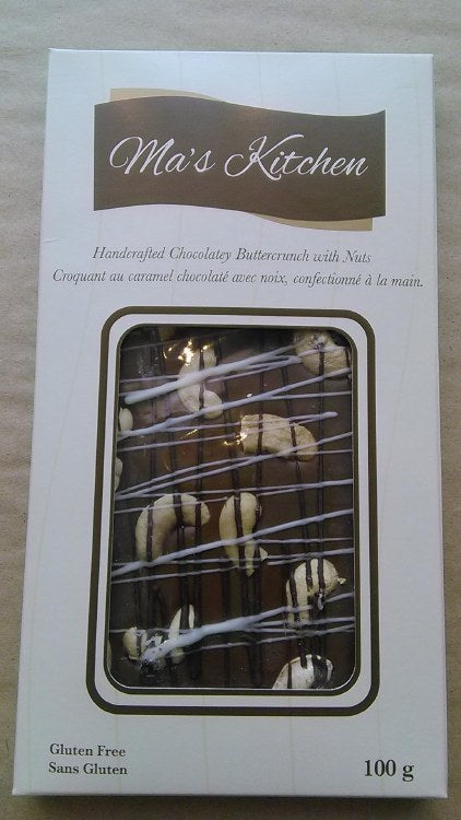 Handcrafted chocolatey buttercrunch with nuts. Gluten free. 100 grams