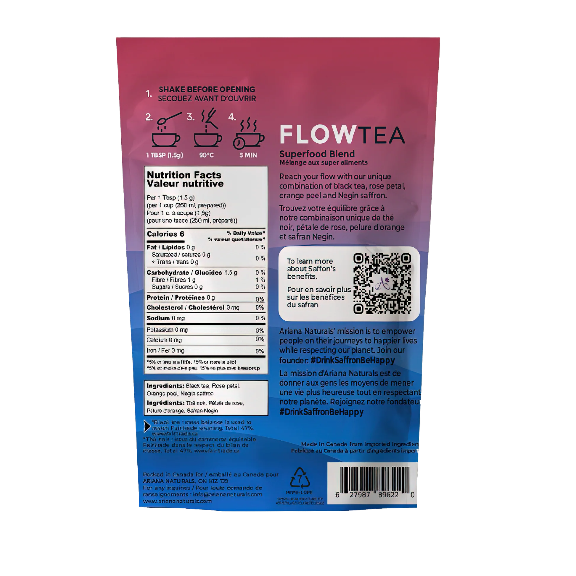 Embrace your mental flow with this unique combination of Black tea, Rose Petal, Orange Peel, and Negin Saffron loose-leaf tea.