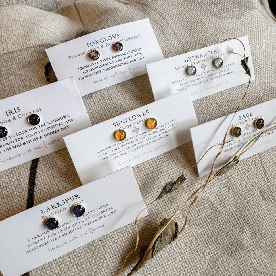 Stunning iris flower carefully preserved in crystal-clear resin. These 5mm studs showcase the lush beauty of irises. Each stud is carefully handcrafted to capture the delicate petals and intricate details of this beloved garden flower. These versatile earrings transition seamlessly from day to evening, adding a touch of botanical elegance to any ensemble.