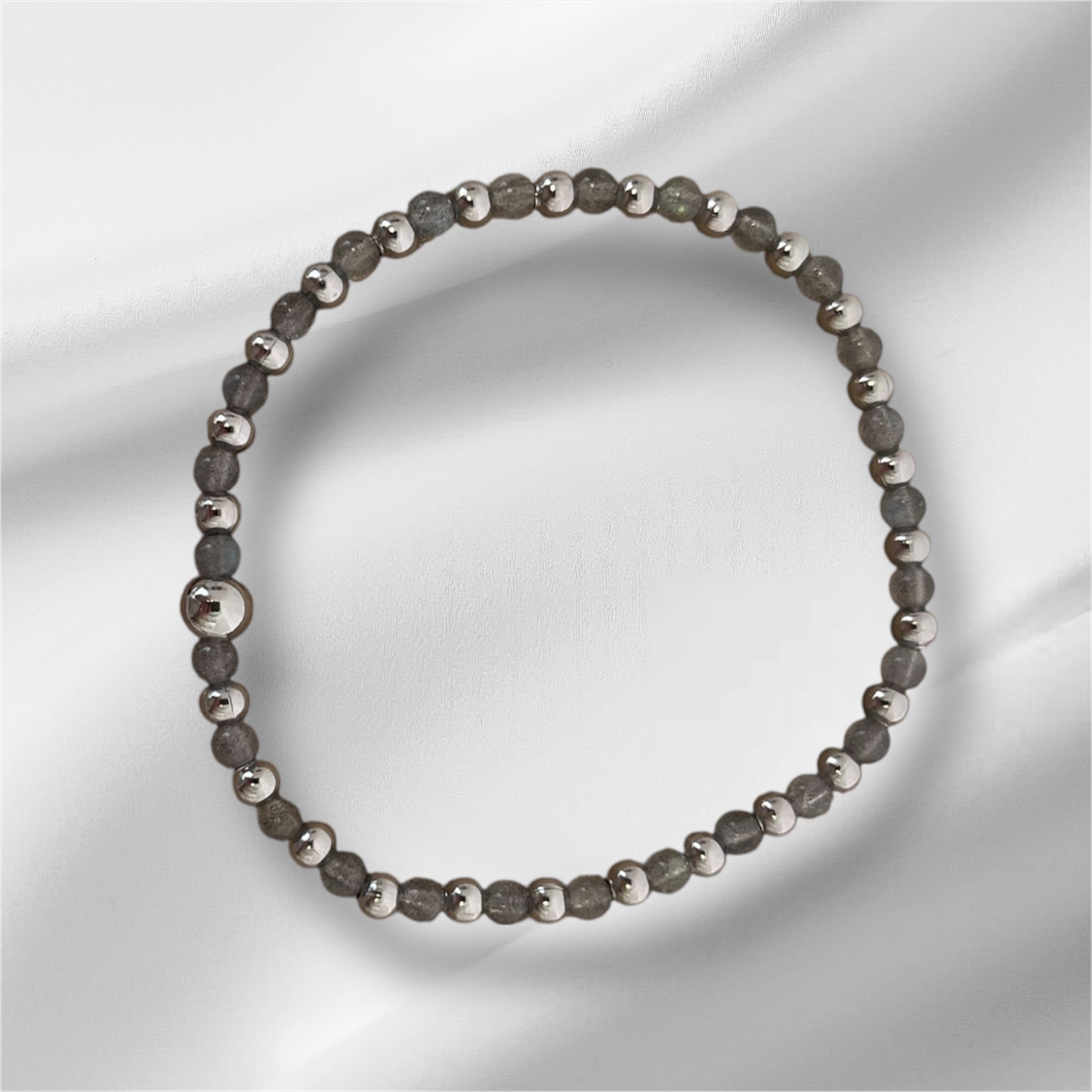 This elegant bracelet features delicate 4mm gemstone beads paired with durable stainless steel spacers, offering a subtle yet sophisticated look. Crafted on stretch elastic, it ensures effortless wear and a comfortable fit for most wrists. Wear it solo for a minimal statement or stack it to enhance your style with layered charm.