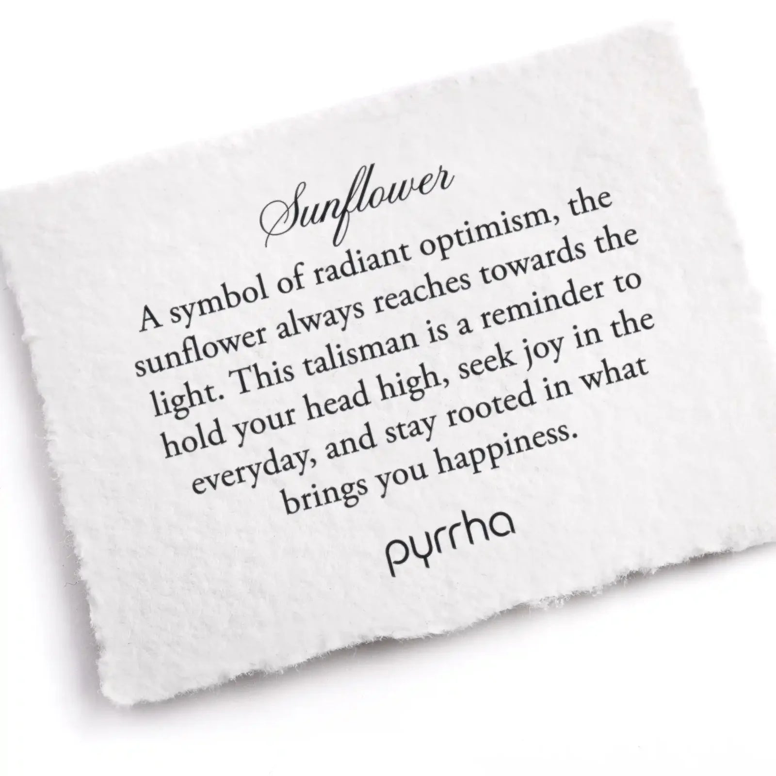 A symbol of radiant optimism, the sunflower always reaches towards the light. This talisman is a reminder to hold your head high, seek joy in the everyday, and stay rooted in what brings you happiness.