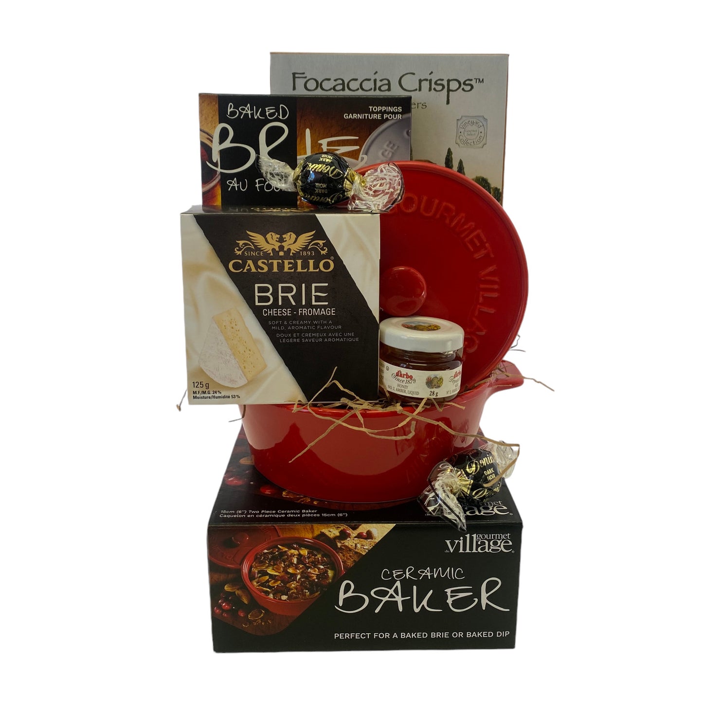 Features a ceramic brie baker; brie cheese, brie topper, focaccia crisp crackers, mini jar of Austrian honey and 2 chocolate truffles