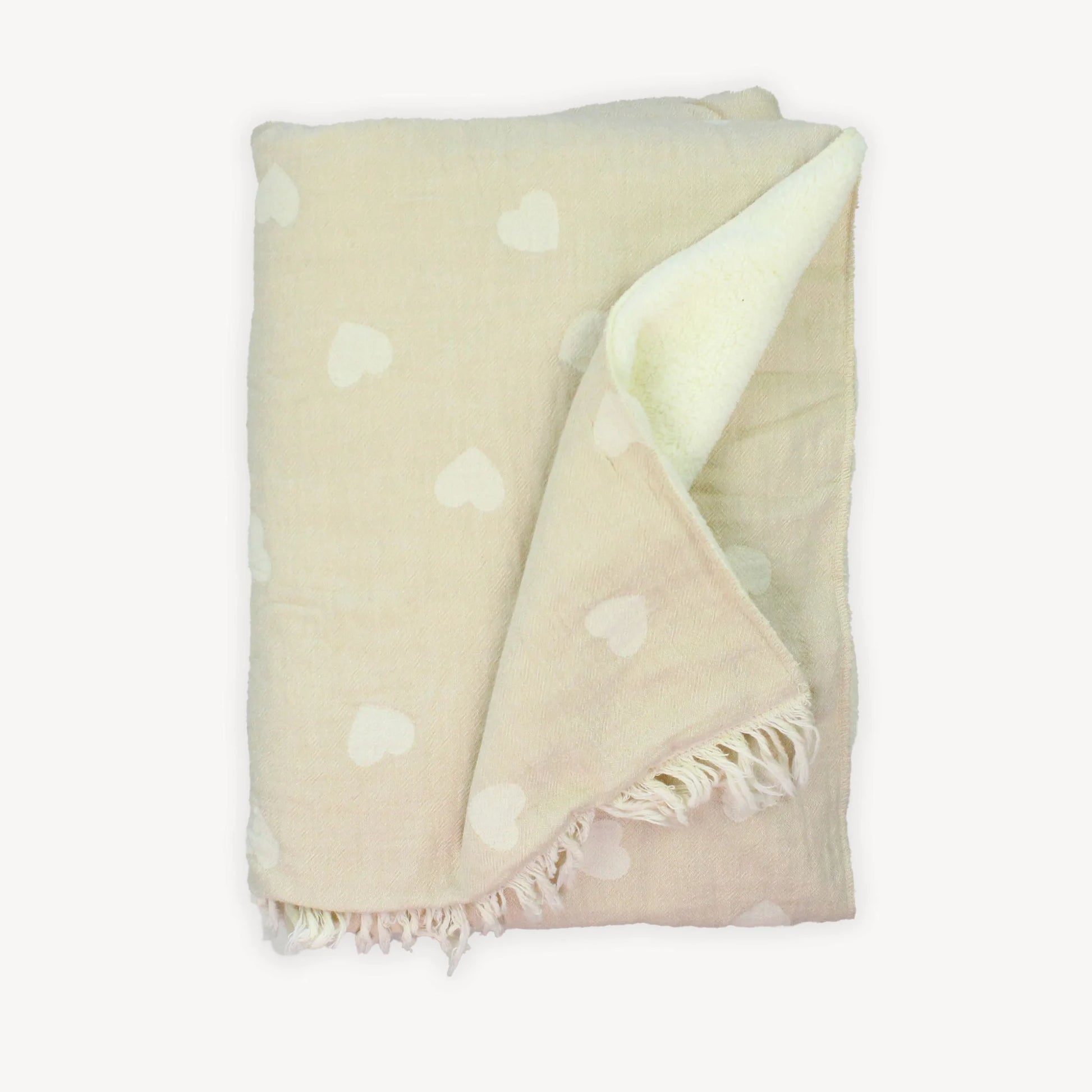 A love-ly addition to our fleece-lined throw collection, the Have a Heart throw encapsulates Poko's firm beliefs that all love matters, every type of relationship is precious and love is always the answer. Featuring our warm shell color and a delicate eyelash fringe, this throw is what we would call light to medium weight with a beige or ‘ecru’ tone fair trade fleece.