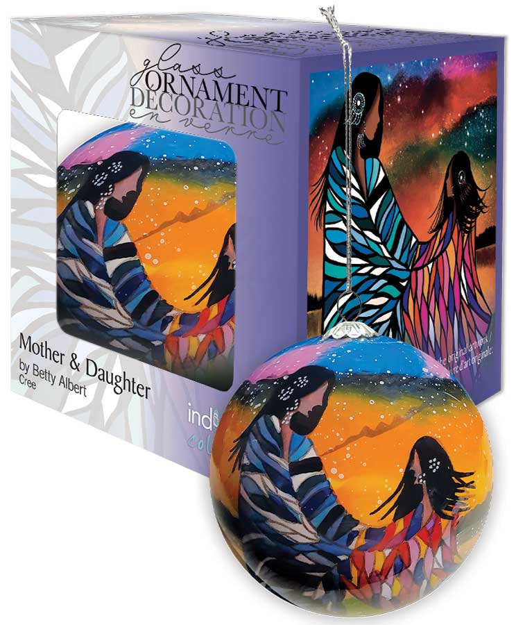 Mother & Daughter glass Ornament by artist Betty Albert. Her cultural background is Cree. The artist is paid a royalty on every sale.