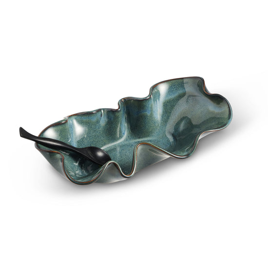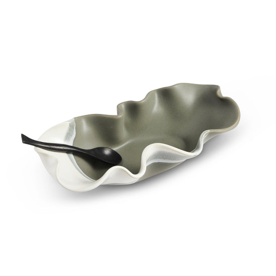 It’s an oblong shaped bowl. There isn’t another way to describe it. Comes with a medium rosewood spoon. All of our pottery is oven, dishwasher and microwave proof as well as food and drink safe.