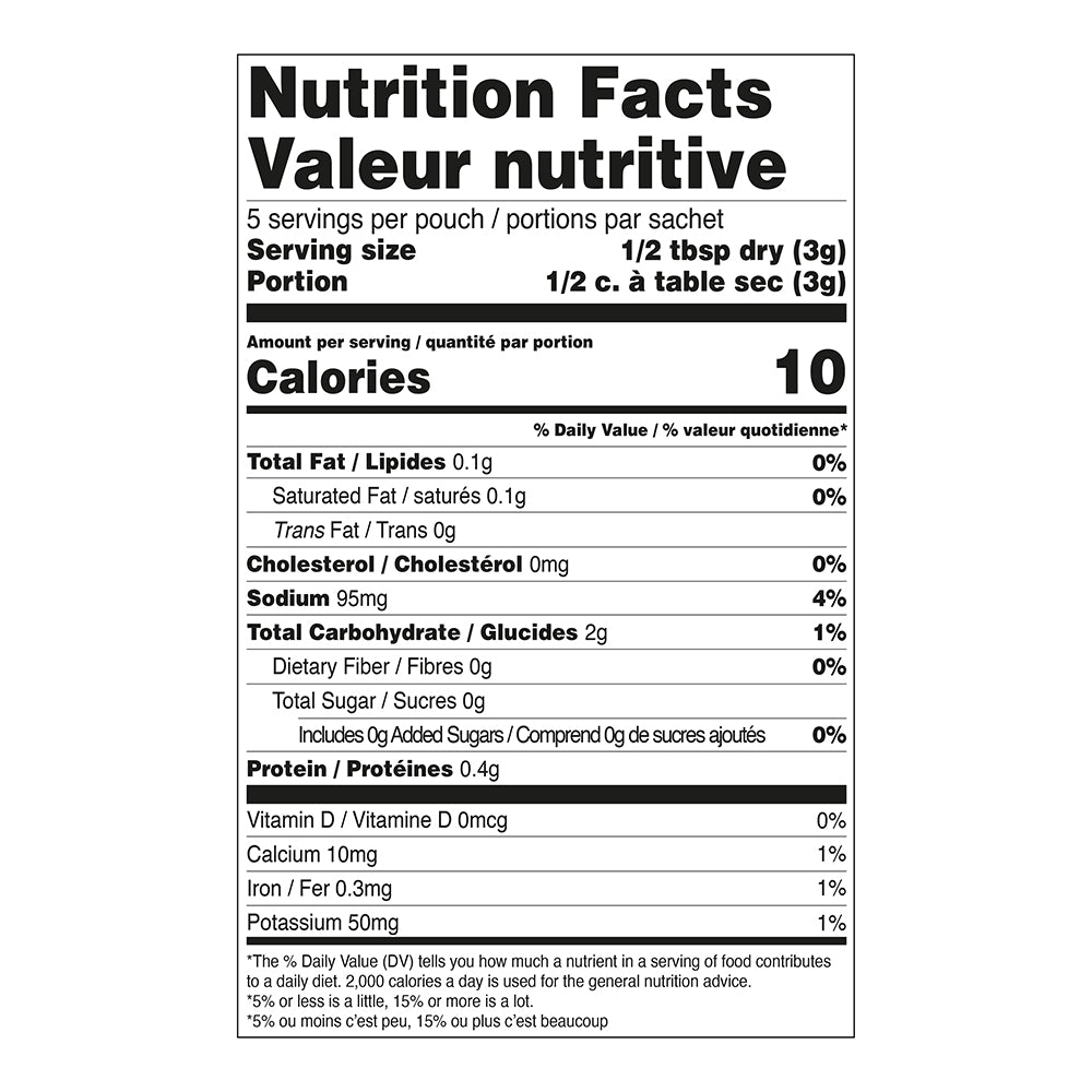 Ingredients: Dehydrated vegetables (onion, garlic, leek, green onion, red bell pepper), Spices, Sea salt, Mustard, Corn starch, Cheese flavour (maltodextrin, whey solids, natural parmesan cheese flavour, salt), Lemon peel, Citric acid.