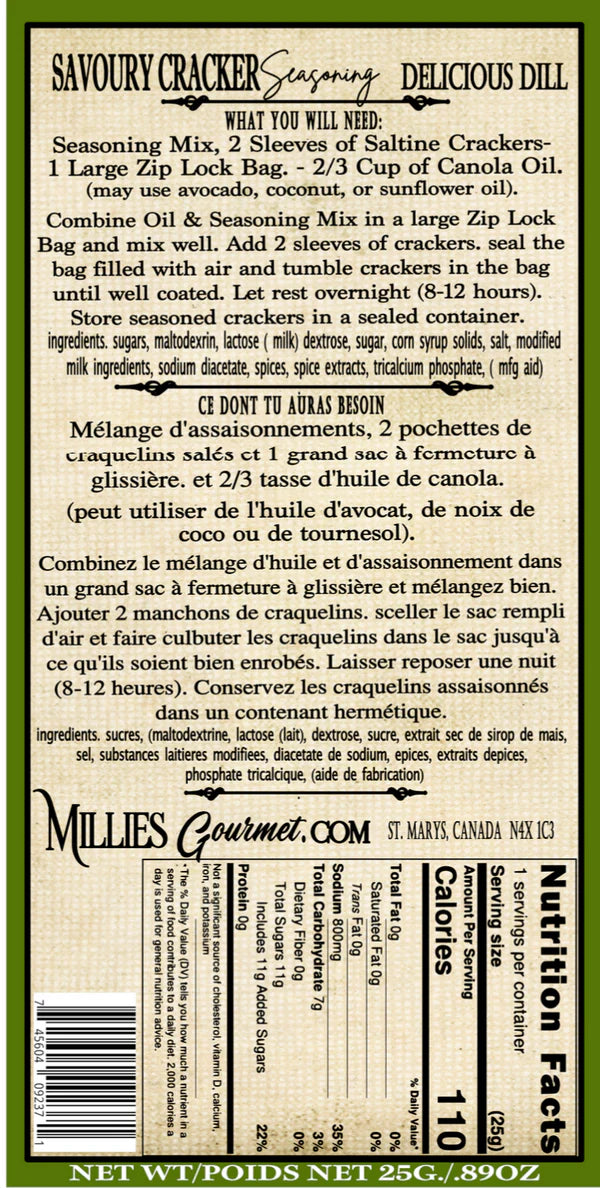 At Millie's Gourmet, we understand the importance of infusing your snacks with exceptional flavor. That's why we are thrilled to introduce our delectable Dill Cracker Seasoning. Bursting with the fresh and zesty taste of dill, this seasoning is designed to elevate your crackers to a whole new level of deliciousness.