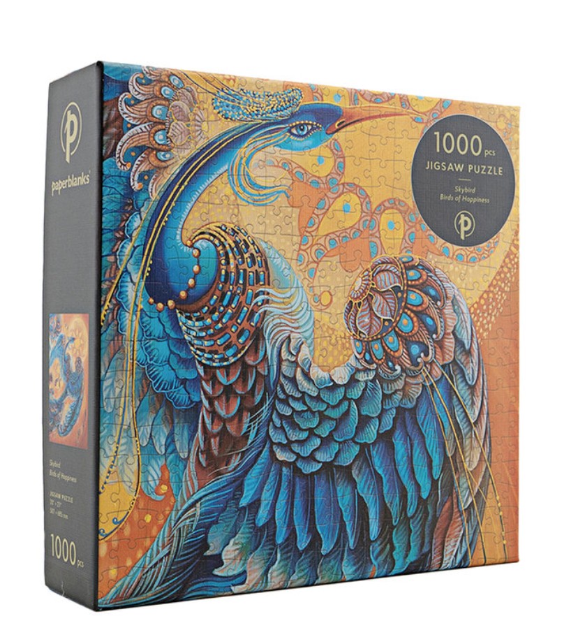 Legend has it that hanging a Bird of Happiness in one's home will bring health and happiness. Artist Nadezhda Sokolova has taken inspiration from this classic tale of Russian folklore with this Skybird design. Using her unique style of batik painting on silk, Sokolova captures the warmth and optimism of the legend.- Premium quality blue board (specially formulated cardboard) - 1000 jigsaw pieces - Complex imagery - Decorative printed and textured paper.