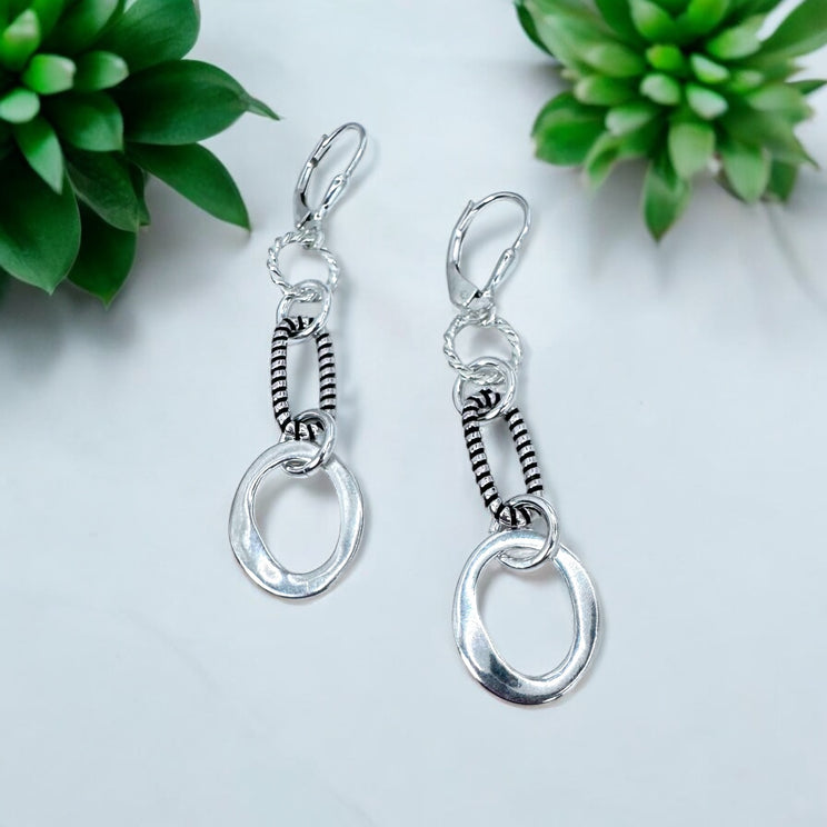 These stunning earrings are a true fashion statement, showcasing a beautifully twisted oxidized silver oval ring that adds a unique touch to any outfit. The abstract silver element intertwined with the ring catches the light in the most captivating way, creating a dazzling effect that is simply a delight to behold.